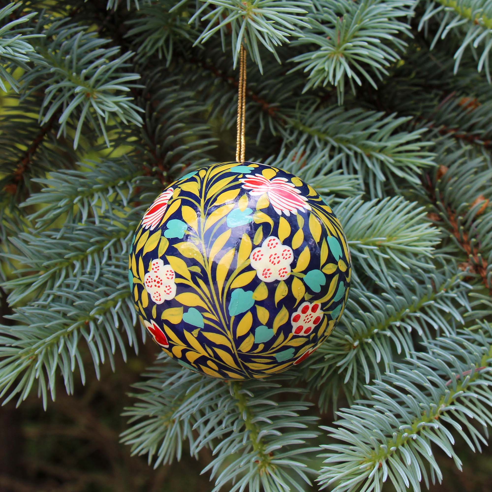 Handcrafted in India with a traditional papier-mâché technique, these beautiful hand-painted ornaments celebrate the season with bright floral and botanical designs.  Each piece is a small piece of art.