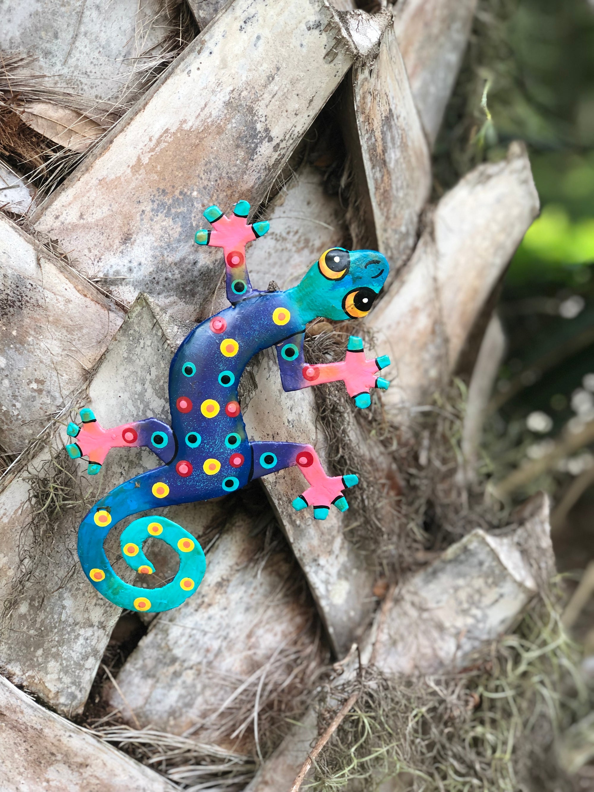 Eight inch Painted Gecko Recycled Haitian Metal Wall Art Blue-Greens Blue Candy