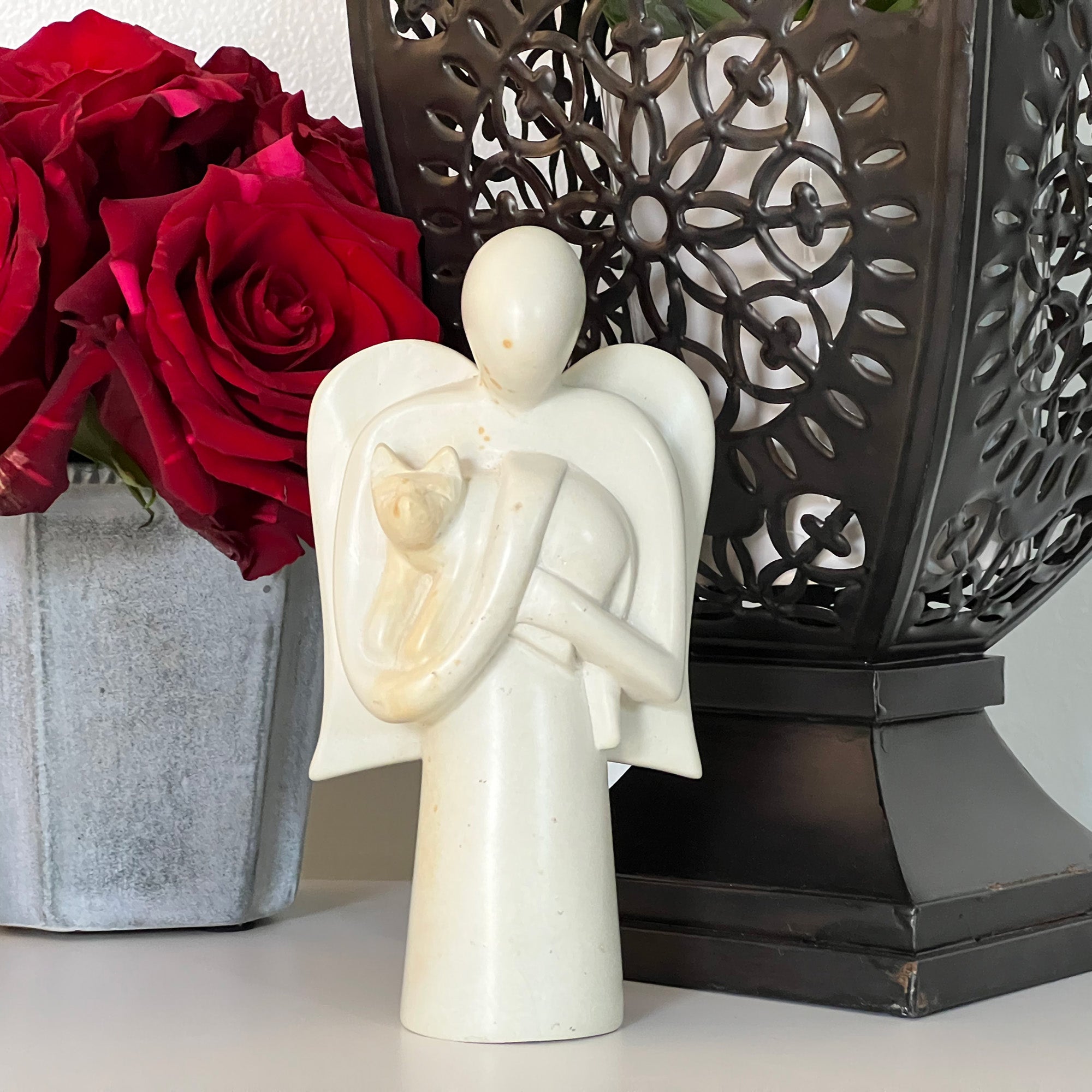 Hand-carved from a single piece of Kisii soapstone by African artisans, this sculpture features an angel with a dog in her arms. The angel is a special gift for someone with a beloved pet or to gift for someone who's beloved pet has crossed over the rainbow bridge.